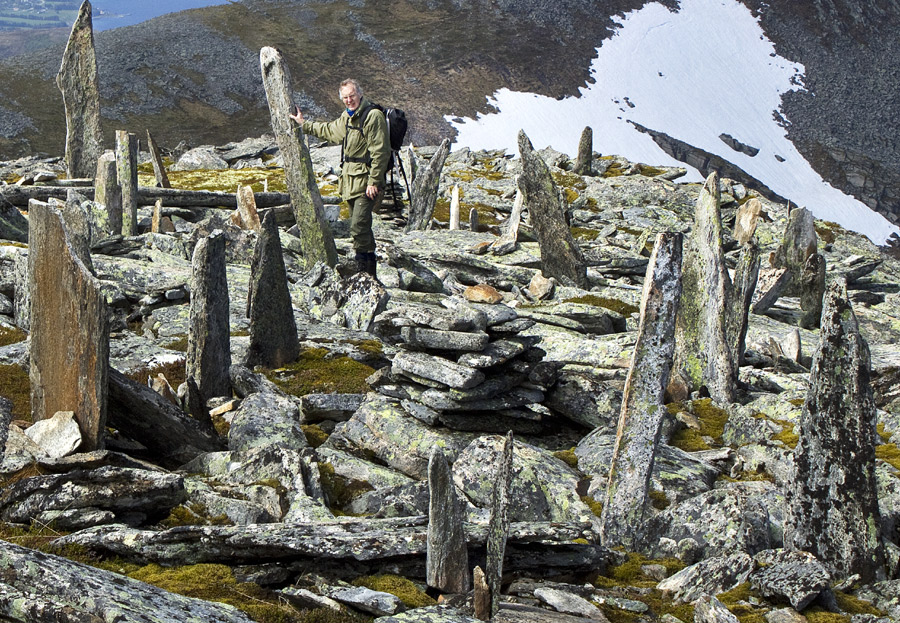«Høgt oppe i fjellet og frå langt tilbake i tid, jamvel forbi historiebøkene – finn vi spor av eit ukjent, gåtefullt fangstfolk som må ha levd i høgfjellet. Kva er dette for noko? Bautasteinar på fjelltoppar, bogestillingar, leiemurar gjennom fjellsidene, primitive buplassar, steinsirklar, labyrintar, mengder av steinformasjonar. Desse omfattande funna i høgfjellet reiser ei rad spørsmål. For det første er det ei stor gåte kvifor forskarar og historikarar ikkje har vist interesse for fjellheimen på Nordvestlandet. Her kan finnast det første kapitlet i historia om Noreg.»